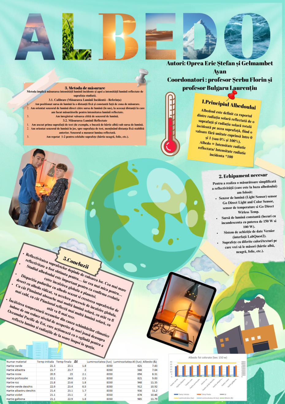 Albedo. Studiul reflectivitatii si absorbtiei luminii – Proiect realizat de Oprea Eric Ștefan și Gelmambet Ayan, clasa a VIII-a și coordonat de domnii profesori Bulgaru Laurențiu și Șerbu Florin Constantin a obținut medalie de bronz la secțiunea Științe aplicate (juniori)