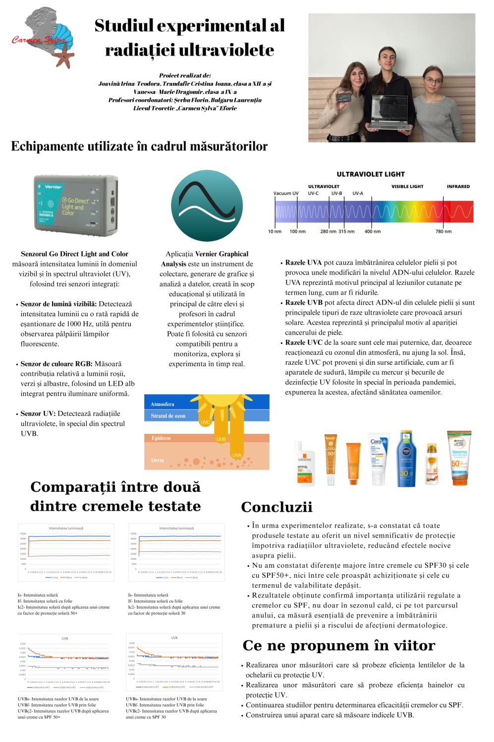 Studiul experimental al radiației ultraviolete – Proiect realizat de Joavină Irina-Teodora, Trandafir Cristina-Ioana, clasa a XII-a și Dragomir Vanessa- Marie, clasa a IX-a și coordonat de domnii profesori Bulgaru Laurențiu și Șerbu Florin Constantin a obținut medalie de bronz la secțiunea Științe aplicate (seniori)